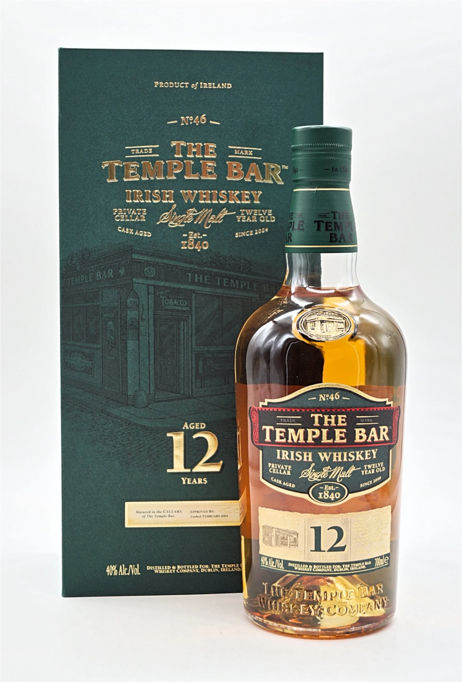 Der The Temple Bar 12 Jahre Single Malt Irish Whiskey ist das derzeitige Flaggschiff der The Temple Bar Whiskeys. Der Besitzer der Temple Bar in Dublin, Tom Cleary, will mit seinen Whiskeys die irische Tradition des hauseigenen Pub-Whiskeys wieder aufleben lassen. Der Temple Bar 12 Jahre wird zunächst auf besonders kleinen, kupfernen Brennblasen destilliert, bevor er in ehemalige Bourbon-Casks abgefüllt wird. Gelagert werden die Fässer im Keller unter der Temple Bar selbst. Die 12-jährige Reifung und die Destillation auf den kleinen Brennblasen verleihen dem Whiskey einen besonderen Charakter, den man sich nicht entgehen lassen sollte.