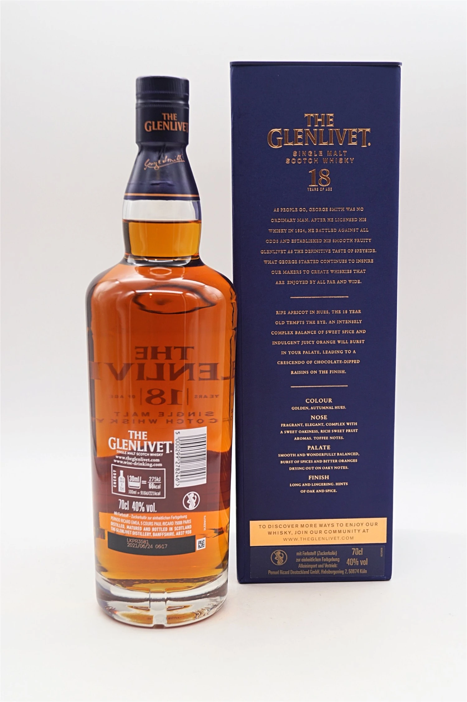 Im Laufe von 18 Jahren hat der Master Distiller Alan Winchester durch die Kombination verschiedener Fasstypen, unter anderem amerikanische Eiche erster und zweiter Befüllung (für die tropische Fruchtigkeit) und ehemalige Sherryfässer (für die würzige Komplexität), diese Abfüllung kreiert. Durch die geschickte Anwendung der Destillationkünste entsteht ein fantastischer Single Malt, der komplex und dabei elegant und ausgewogen ist. Der 18-Jährige hat mehr Preise als jede andere Abfüllung gewonnen. Jede einzelne Flasche steht für die Qualität und den Geschmack von The Glenlivet. Jede Flasche verdient in Ihrem Schrank einen Ehrenplatz… vielleicht als Vorrat für den passenden Anlass? Sie wurde ja schließlich gemacht, um zu beeindrucken.