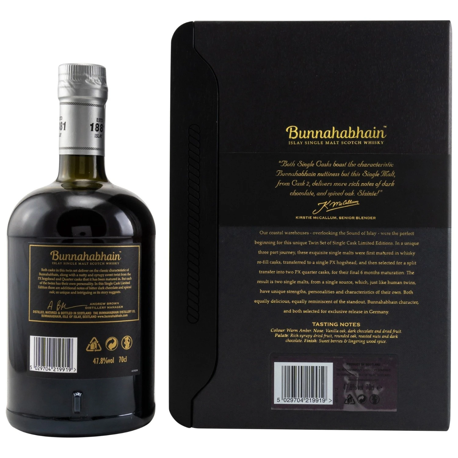 Islays windumtoste Küste ist der Ausgangsort für ein einzigartiges Twin Set aus stark limitierten Single Cask Whiskys. Beide Single Malts des Bunnahabhain 1992 PX Quarter Cask Twin Sets wurden am 10. Februar 1992 destilliert, reiften seitdem in vergleichbaren Fässern – und entwickelten sich gleich menschlichen Zwillingen doch zu zwei Abfüllungen mit ganz eigenem Charakter. Die Whisky-Zwillinge reiften zunächst in Whisky-Refill-Fässern, deren Inhalte 2004 in einem PX Hogshead vereint wurden. Im Oktober 2018 schließlich wanderte der Whisky für sein Finish in zwei PX Quarter Casks.