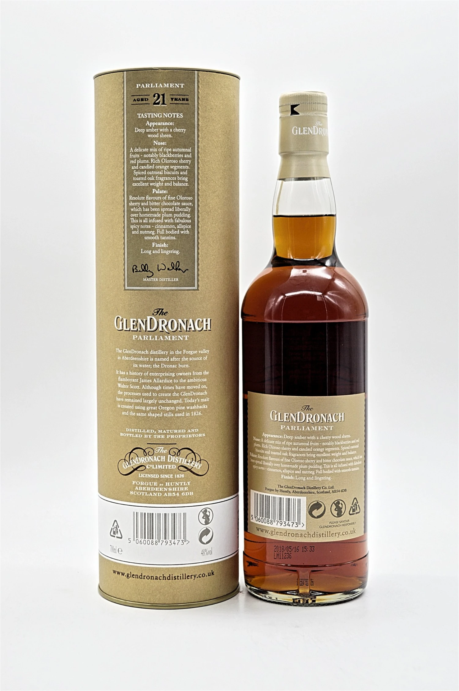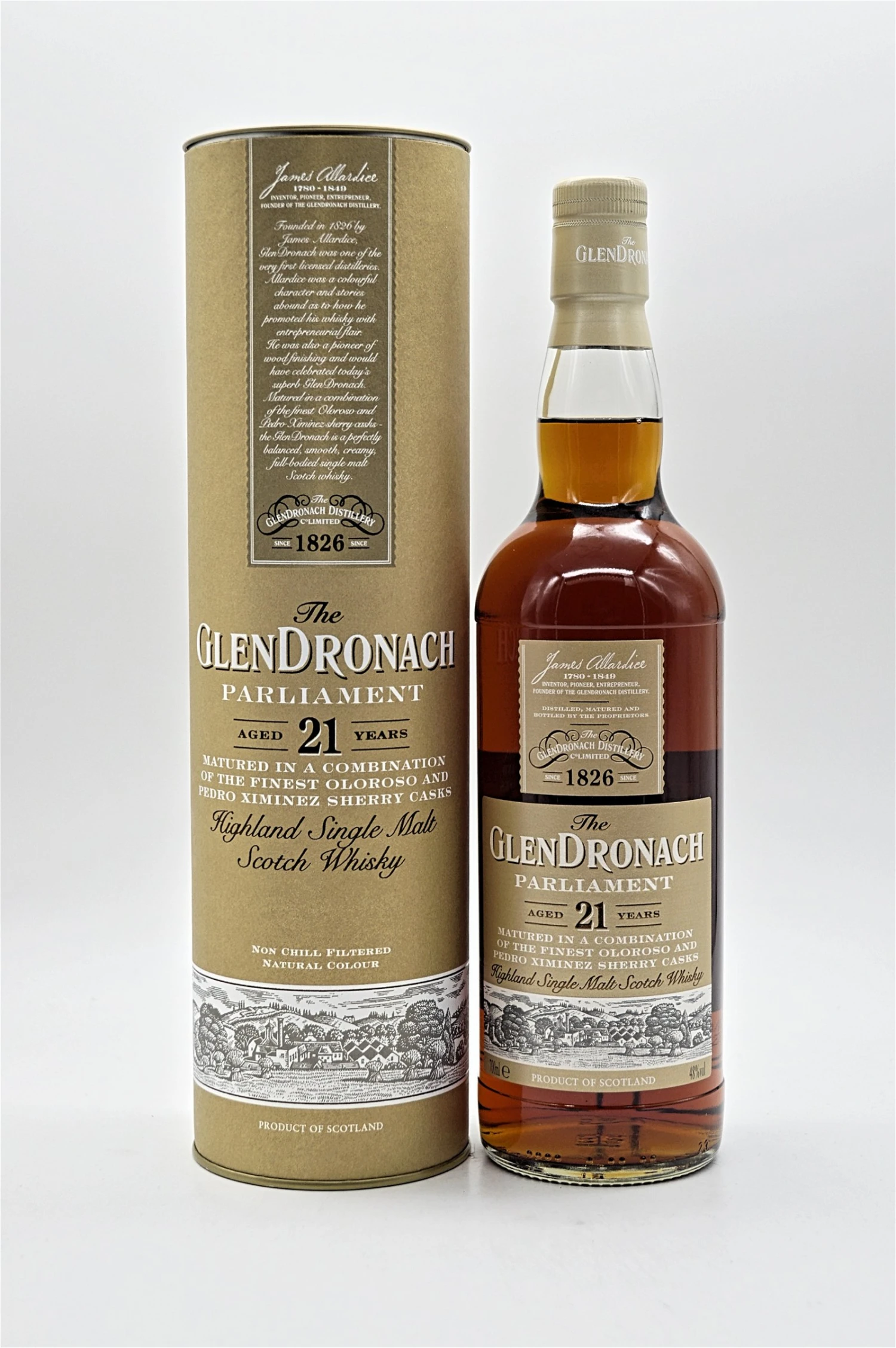 Der König des GlenDronach Kern-Sortiments. Dieser Highend Single Malt Scotch präsentiert sich, entsprechend seiner royalen Stellung, komplett in einer goldenen Verpackung. Der 21 jährige Parliament stammt aus den besten Oloroso und Pedro Ximénez-Sherryfässern aus den Lagerhäusern der Glendronach Brennerei und konnte sich deshalb mit den feinsten Sherrynoten vollsaugen. In Kastanienbraun und dunklem Rost-Rot, kommt dieser Malt auf ganz natürlichem Wege zu seiner satten Farbe und schlägt mit stolzen 48% Alkoholvolumen zu Buche. Auf die Kühlfilterung wurde hier verzichtet. Ein würdiger Vertreter des voluminösen GlenDronach Hausstils.