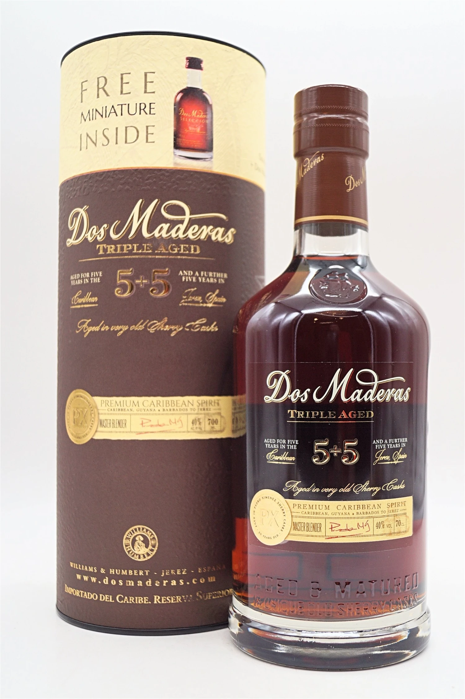 Ausgewählte Rums aus Barbados und Guyana reifen 5 Jahre lang in amerikanischen Eichenfässern in der Karibik. Danach wird dieser Blend ins andalusische Jerez transportiert, um in dem Sherry-Haus Williams & Humbert weitere 3 Jahre nach dem Solera-Verfahren in hochwertigen Palo Cortado Fässern zu lagern. In der letzten Phase des Reifeprozesses lagert Dos Maderas 5+5 PX weitere 2 Jahre im Solera-Verfahren in den Fässern des “Don Guido” – ein 20 Jahre alter Pedro Ximénez-Sherry (V.O.S.). Sein Triple Ageing macht den Dos Maderas PX einzigartig, mit einem Bouquet von unvergleichlichem Geschmack und Aroma.