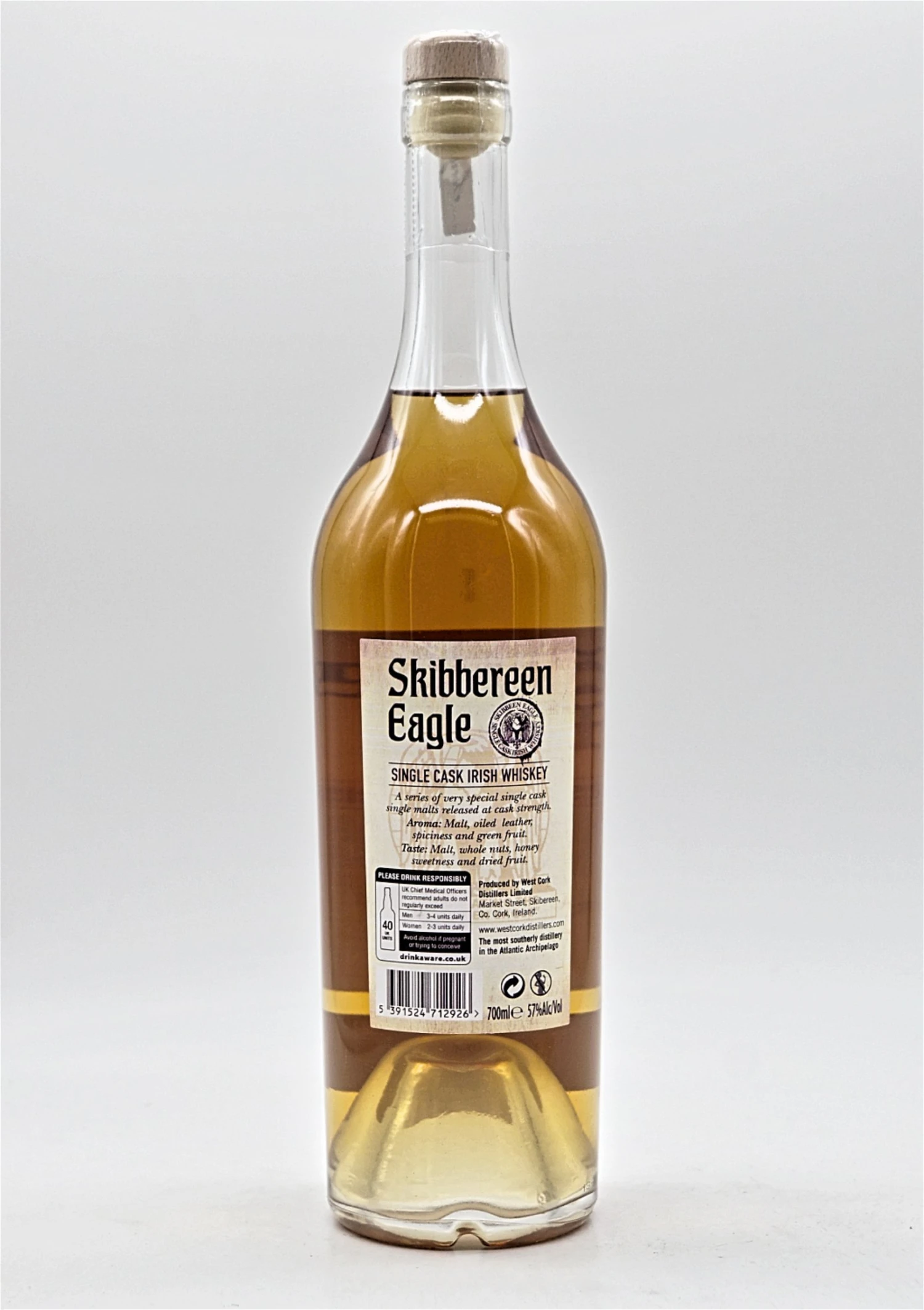 Unter dem Namen „Skibbereen Eagle“ bringt West Cork erstmals Einzelfassabfüllungen auf den Markt. Dieser Single Malt in Fassstärke aus dem Fass Nummer 3 zählt auch zu der Serie. Der Whiskey reifte in einem ehemaligen First Fill Bourbon Barrel. Da er mit 57% Alkoholvolumen abgefüllt wurde, fallen die Aromen entsprechend intensiv aus. Vor allem zeichnet diese Abfüllung eine besondere Honignote aus, die sich vor allem am Gaumen wiederfinden lässt. Daneben kommen typische Fruchtnoten und süße Malznoten zum Tragen. Wie man es von West Cork kennt und schätzt, wurde der Whiskey weder gefärbt noch kühlgefiltert, sondern komplett naturbelassen abgefüllt. Da es sich um eine Einzelfassabfüllung handelt, ist die Flaschenanzahl entsprechend limitiert. Jede Flasche ist nicht nur mit der Fassnummer, sondern auch noch mit der einzelnen Flaschennummer versehen. Die Brennerei von der Westküste Irlands setzt voll auf Transparenz. Auch in einem weiteren Punkt bleibt sich West Cork treu: Guten Whiskey zum fairen Preis. Auch die Single Cask Abfüllungen von West Cork zeichnen sich durch ihr besonders gutes Preis-Leistungs-Verhältnis aus.