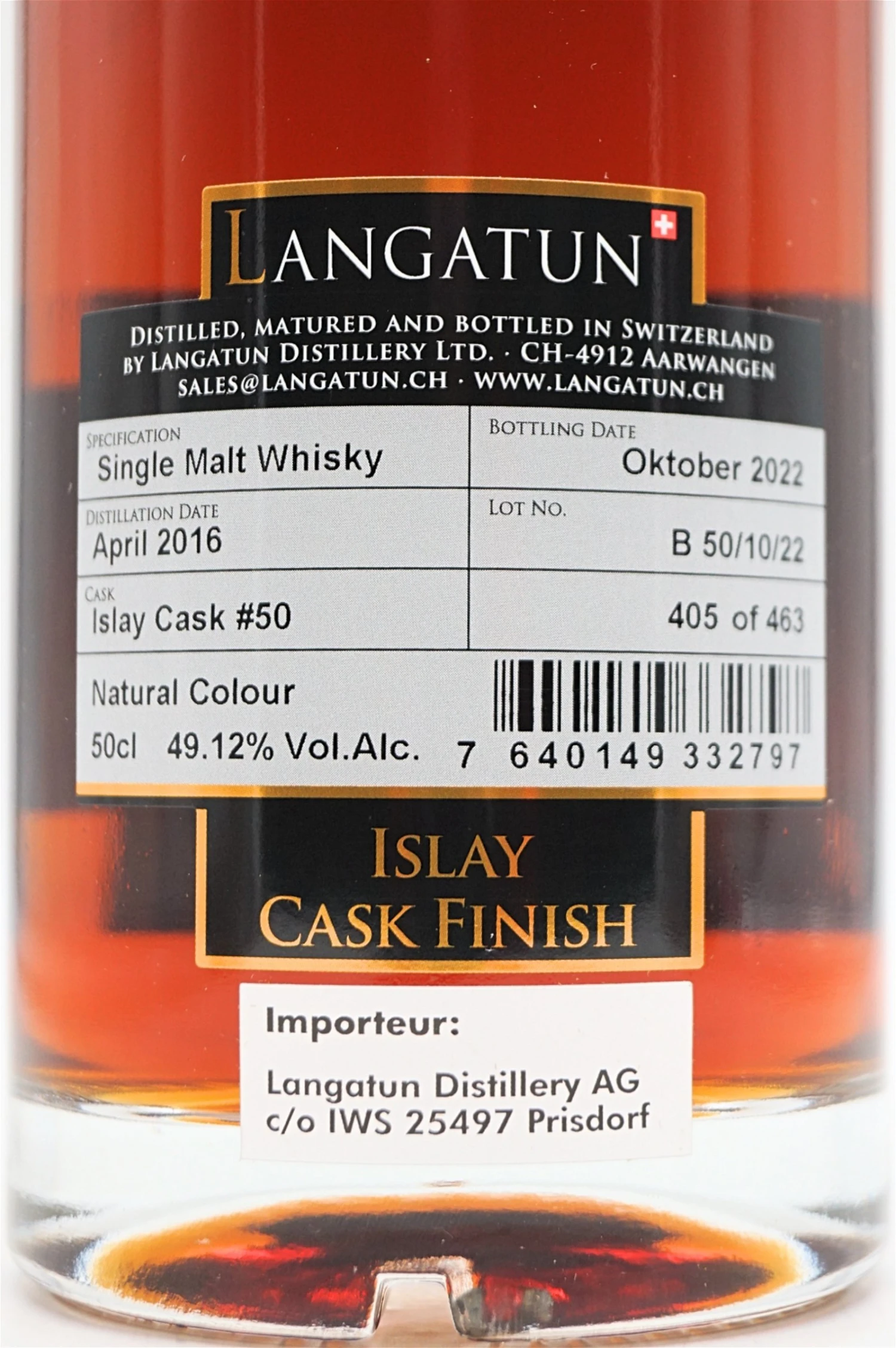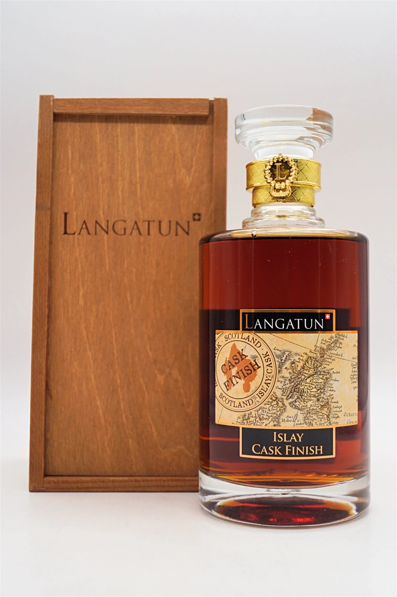 Der Langatun Islay Cask Finish ist eine Abfüllung in aus der Cask Finish Reihe. Nach einer mehrjährigen Vorlagerung in einem Chardonnay Fass, welches dem Whisky einen filigranen Weissweinakzent mit schönen Karamell- und Holznoten verleiht, wird der Single Malt Whisky noch für eine Nachreifezeit in ein ehemaliges Whiskyfass der schottischen Insel Islay umgelagert. Mit diesem speziellen Fass wird der Charakter der Insel Islay subtil auf den wunderbar minuziös gebrannten Schweizer Whisky gelegt.