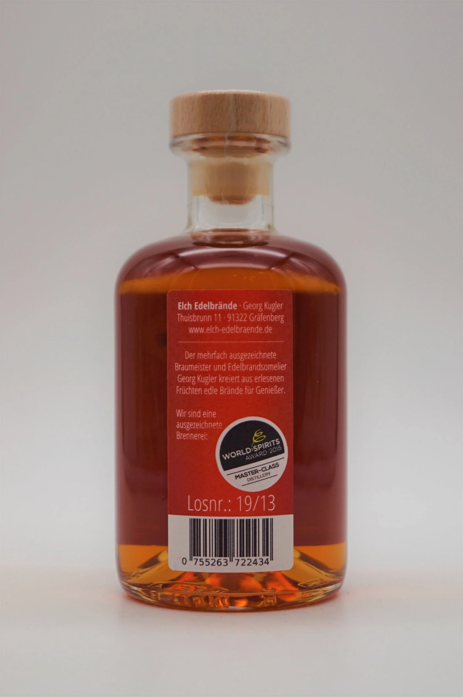 In der Brennerei in Thuisbrunn entsteht unter der Führung des vielfach ausgezeichneten Braumeisters und Edelbrandsomeliers Georg Kugler ein fränkischer Single Malt Whisky aus besten Zutaten. Charakteristisch für diesen Whisky sind die rauchigen Aromen, die sich durch das extra für Sie hergestellte Malz entfaltet. Erstmals wurde Malz mit deutschem Torf (ppm 32) geräuchert, um eine einzigartige Whisky-Spezialität zu erschaffen. Der spezielle und ausgefallene Geschmack macht viele Kenner der Branche auf Sie aufmerksam.