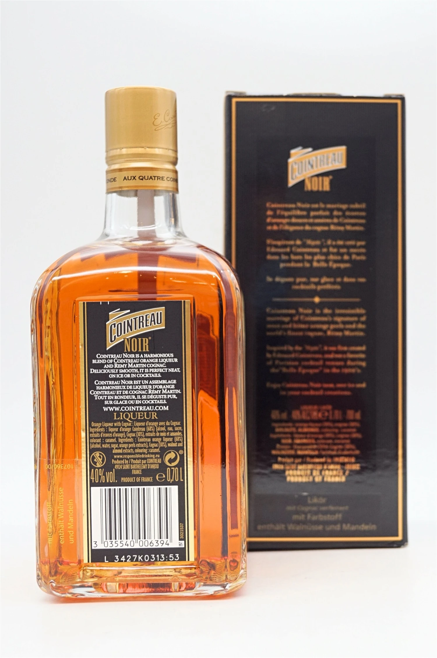 Im Gegensatz zum kristallklaren Cointreau l’Unique ist Cointreau Noir eine bernsteinbraune Spirituose. Die Farbe ergibt sich durch die Kombination aus Cointreau l’Unique, feinstem Rémy Martin Cognac, sowie Mandel- und Walnuss-Mazerationen.