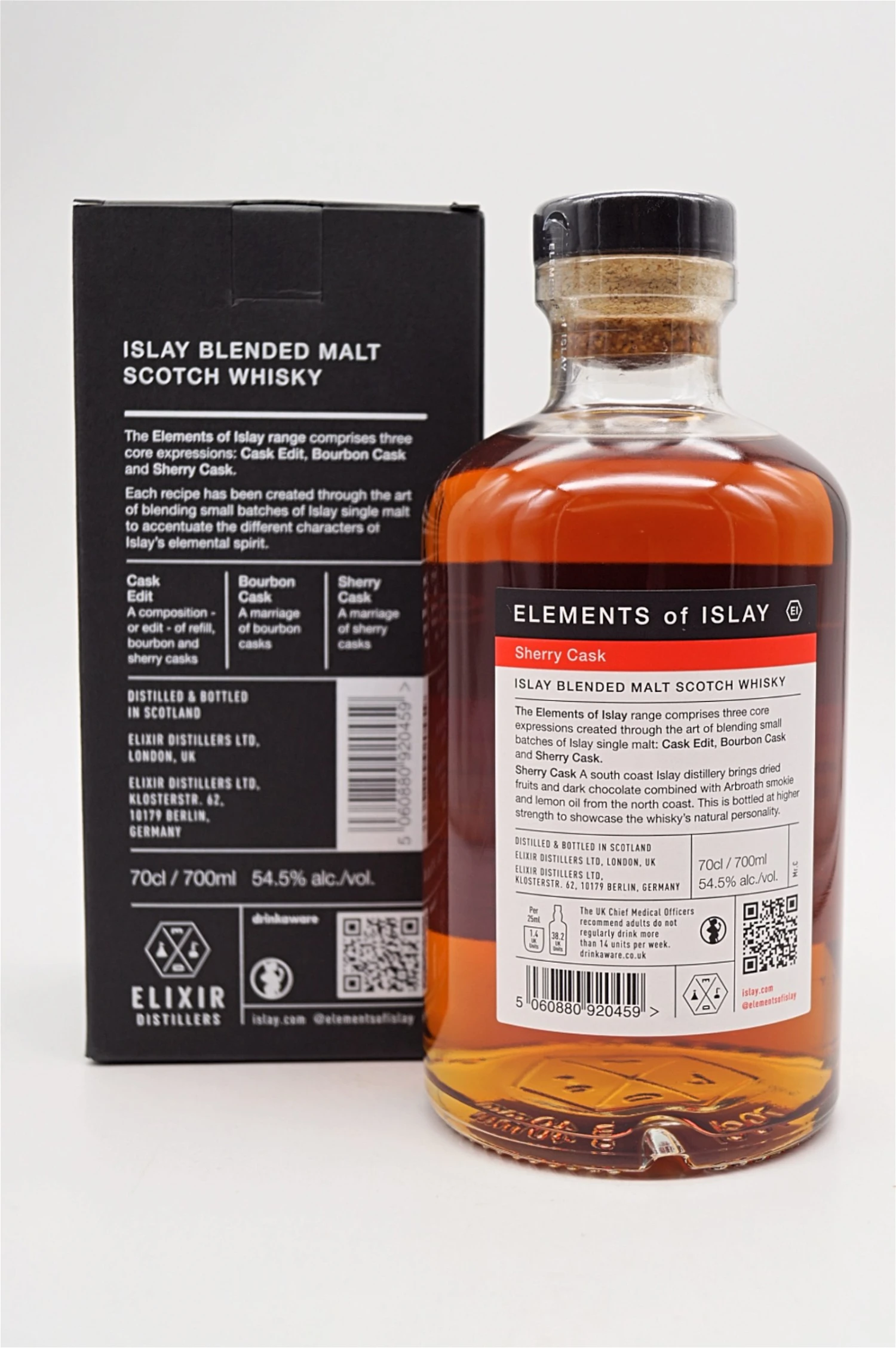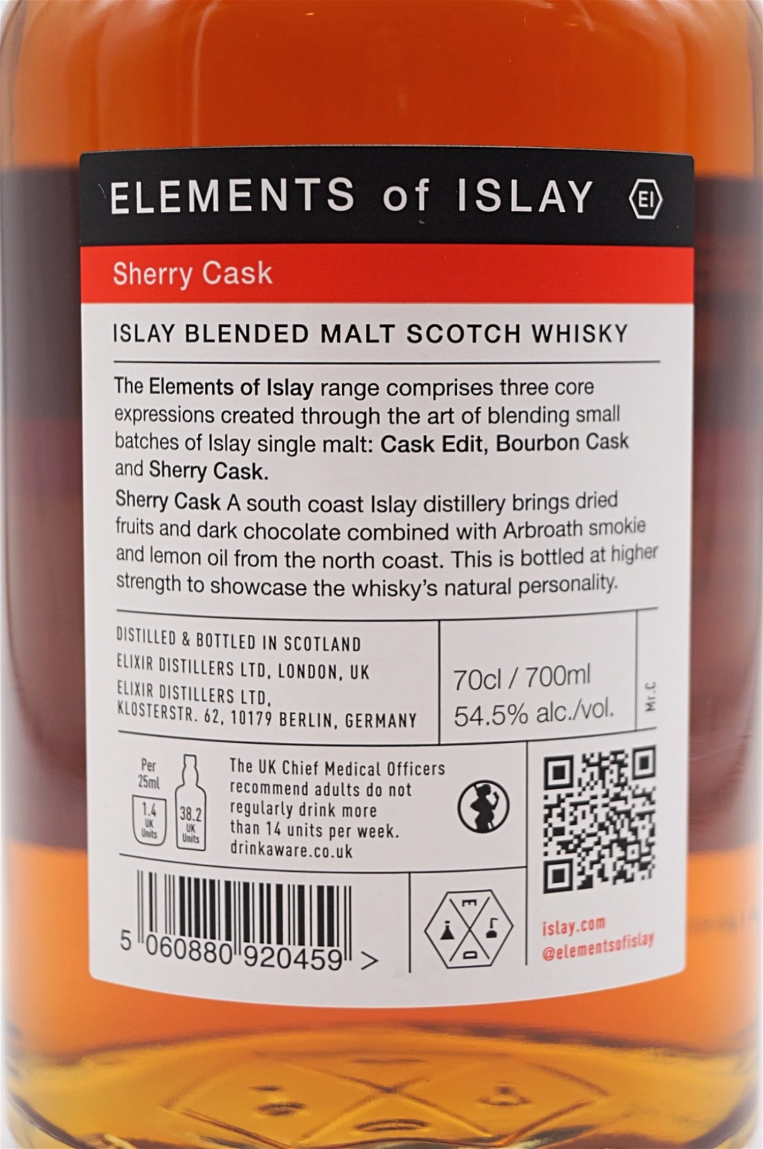Elements of Islay Sherry Cask ist neben Cask Edit und Bourbon Cask Teil der neuen Kernsortiment-Trilogie. Er reift in First-Fill- und Refill-Sherryfässern der Größe Hogsheads und wird mit einer höheren Stärke von 54,5 % abgefüllt, um die natürliche Persönlichkeit des Whiskys voll zur Geltung zu bringen.