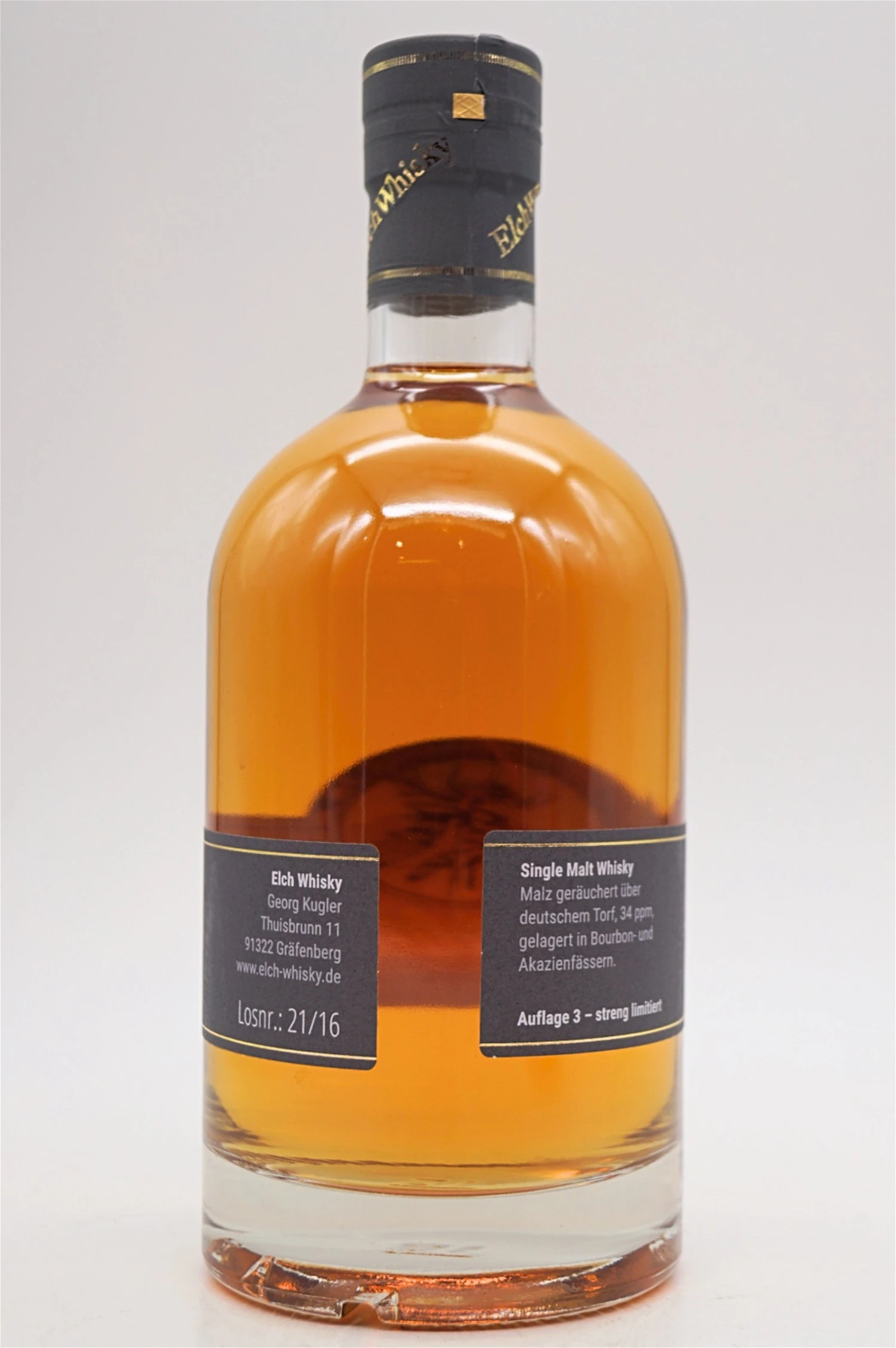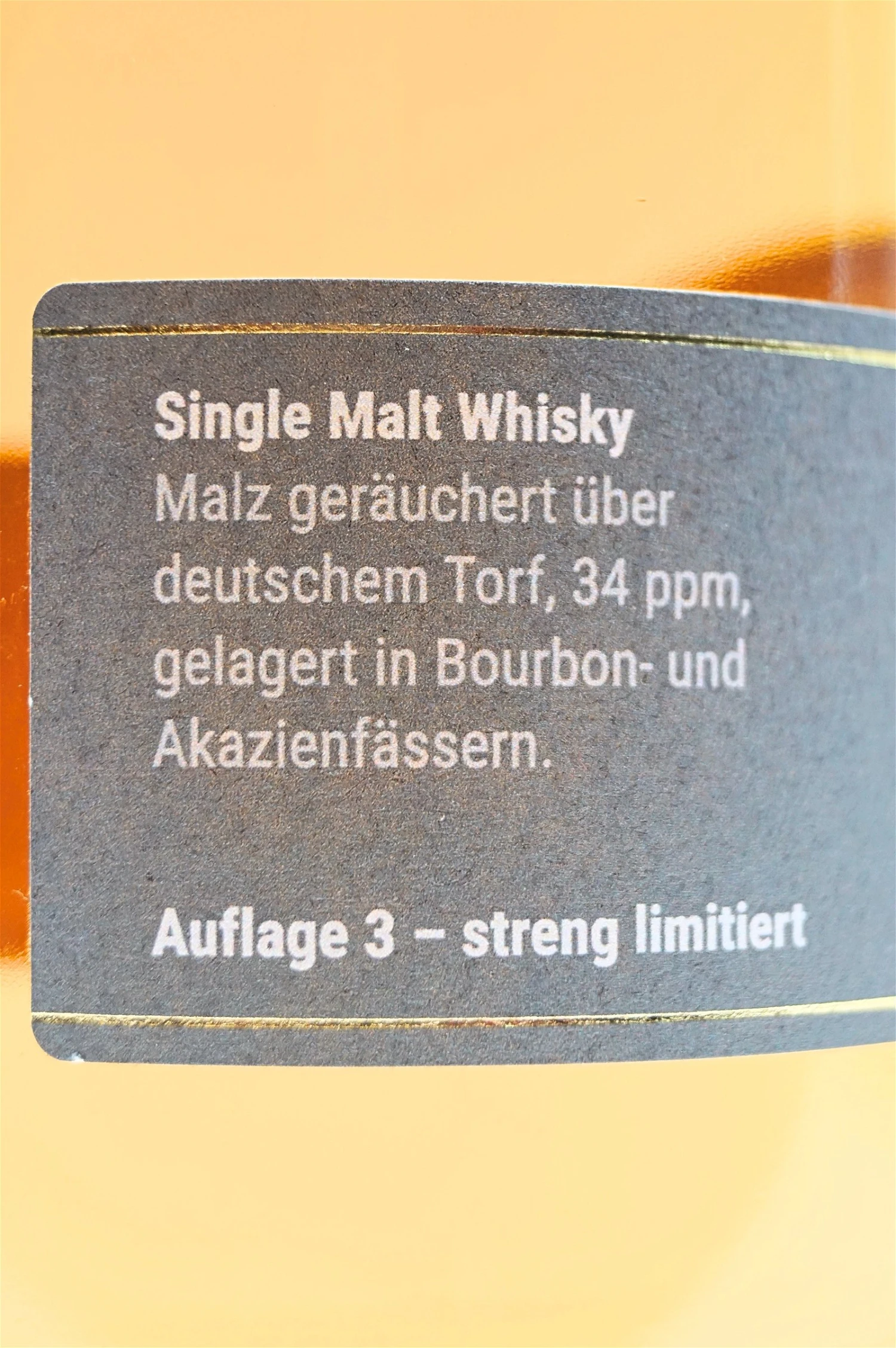 Dazu wurde Malz mit deutschem Torf (ppm 32) geräuchert, um eine einzigartige Whisky-Spezialität zu erschaffen. In der Brennerei wird dieses Malz zu Würze verarbeitet, 7 Tage vergoren und anschließend in der Verschlussbrennerei schonend gebrannt. Das entstandene Destillat wird auf 50,6 % Alkohol verdünnt, bei der Abfüllung „Torfduett“ wurden 90% Bourbon- mit 10% Akazienfässern vermählt.