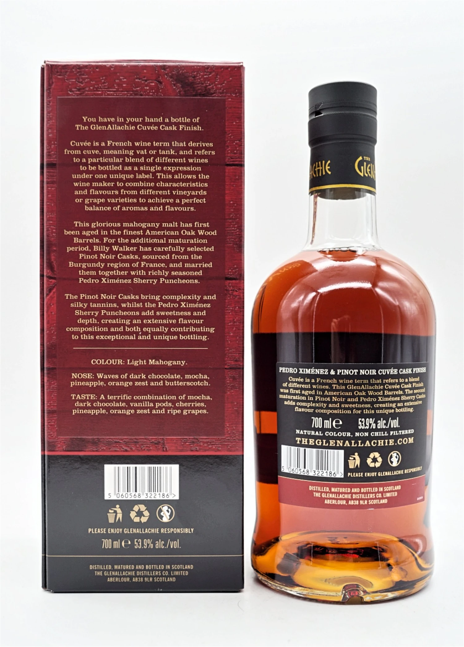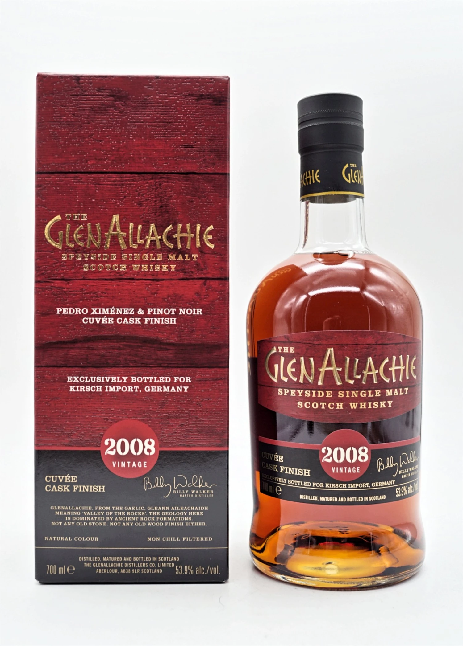 Für die sensible Auswahl und Kombination der Fässer zu GlenAllachies erstem Cuvée ist Fasstalent Billy Walker daher genau der Richtige. Der exklusiv für Kirsch Import abgefüllte Single Malt reifte zunächst in Fässern aus amerikanischem Eichenholz. Für einen zusätzlichen, aromenstarken Reifeprozess wählte Billy Walker sorgfältig mit Pinot Noir vorbelegte Casks aus der französischen Weinregion Burgund aus – und vermählte den Single Malt schließlich mit Speyside Whisky, der in intensiven Pedro Ximénez Sherry Puncheons ausgebaut wurde.